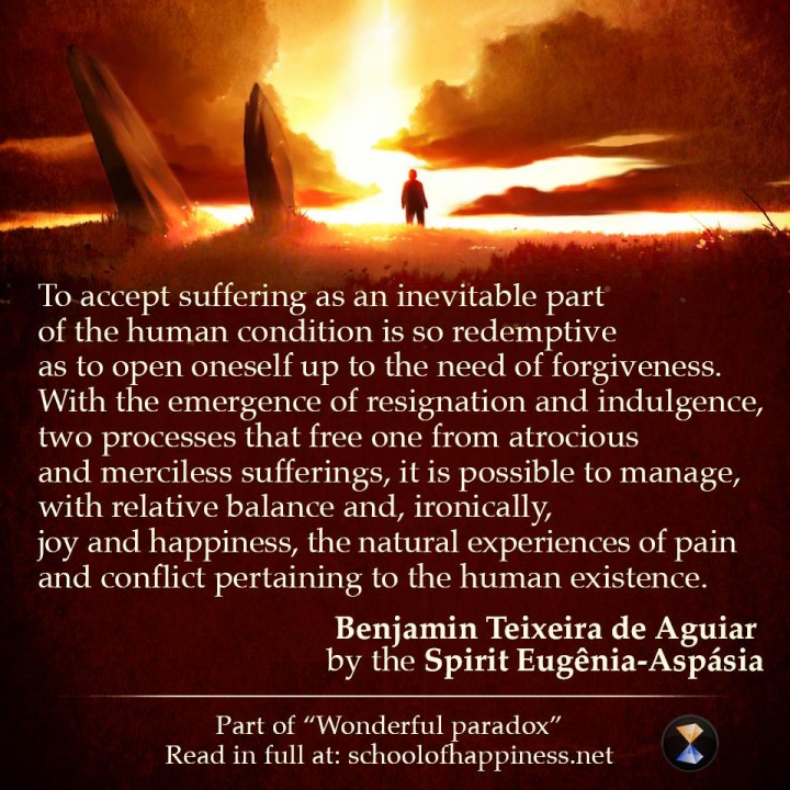 To accept suffering as an inevitable part of the human condition is so redemptive as to open oneself up to the need of forgiveness. With the emergence of resignation and indulgence, two processes that free one from atrocious and merciless sufferings, it is possible to manage, with relative balance and, ironically, joy and happiness, the natural experiences of pain and conflict pertaining to the human existence.