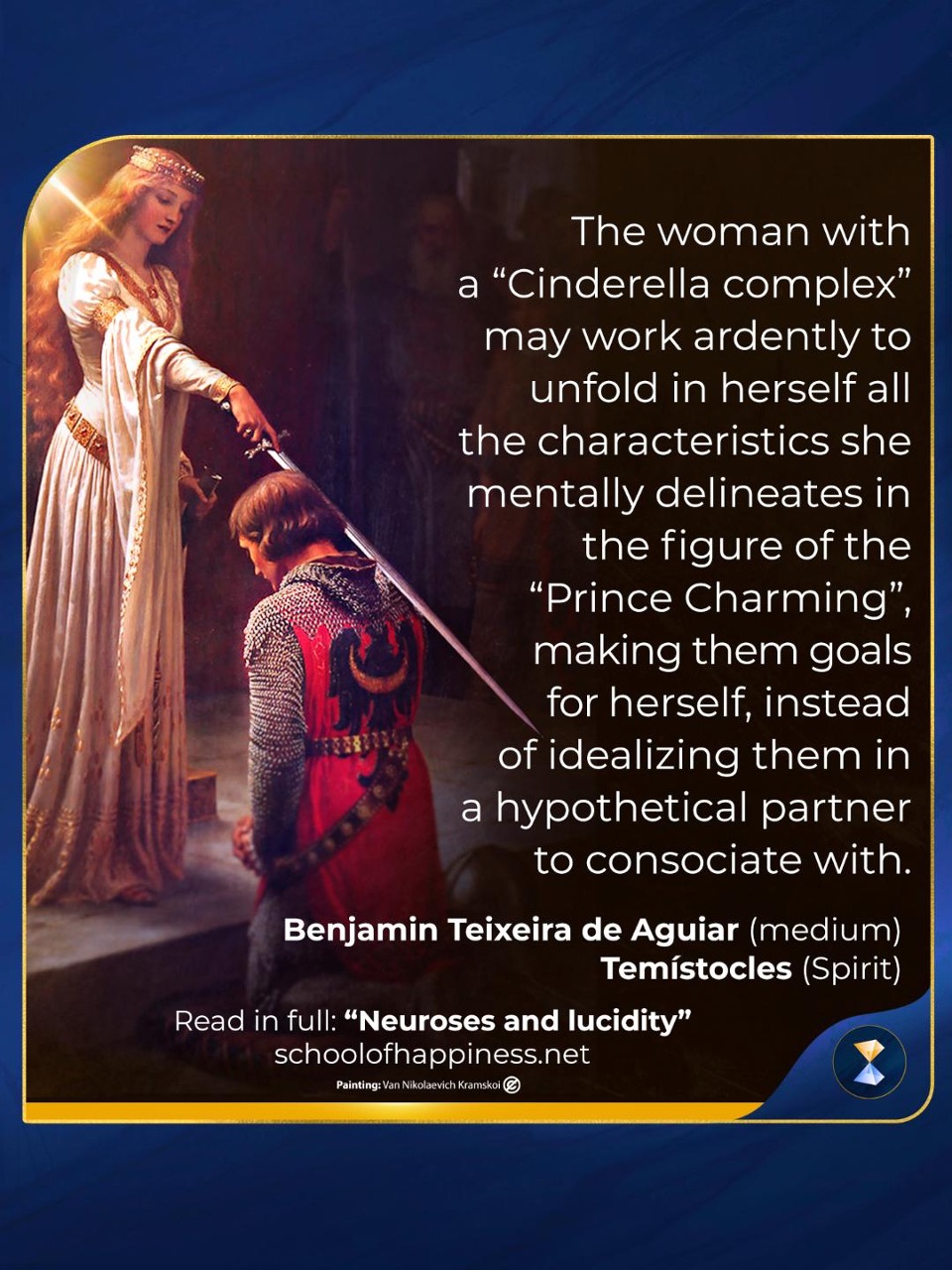 In this sense, those who feel “very sure” of themselves and, at the same time, have realized their reverse of unconscious low self-esteem, as much as the diametrically opposite psychotype: of the person with an inferiority complex at the conscious level, who has already connected to their sense of their unconscious arrogance, can transfer their sense of low self-worth to a sense of reverence and recognition of the Divine power, and project his/her emotional counterpart of overconfidence in God, thus serving Him-Her, in the person of their brothers and sisters in humanity, thereby embracing both sides of the neurotic “inferiority-superiority” coin, a psychic binomial, as there are in fact so many in the structures of the human mind. The two poles begin to act in cooperation, constructively, and both at the conscious level, which is the path of psychological integration sought by all psychotherapeutic schools, because the individual recognizes/acknowledges/accepts his/her own inferiority, and, simultaneously, experiences the compensatory impulse of the superiority-savior, in the image and Person of God. Now, the woman with the “Cinderella complex” may work ardently to unfold in herself all the characteristics that she mentally delineates in the figure of the “Prince Charming”, making them goals for herself, instead of idealizing them in a hypothetical partner to consociate with.